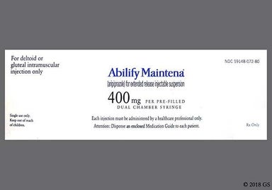 Abilify Maintena (aripiprazole) is a long-acting injection that helps treat schizophrenia and bipolar 1 disorder in adults. It's a type of medication called an atypical antipsychotic. People usually get one dose injected into the muscle once a month at a medical office. Some side effects include weight gain, feeling like you can't sit still, and injection site reactions.