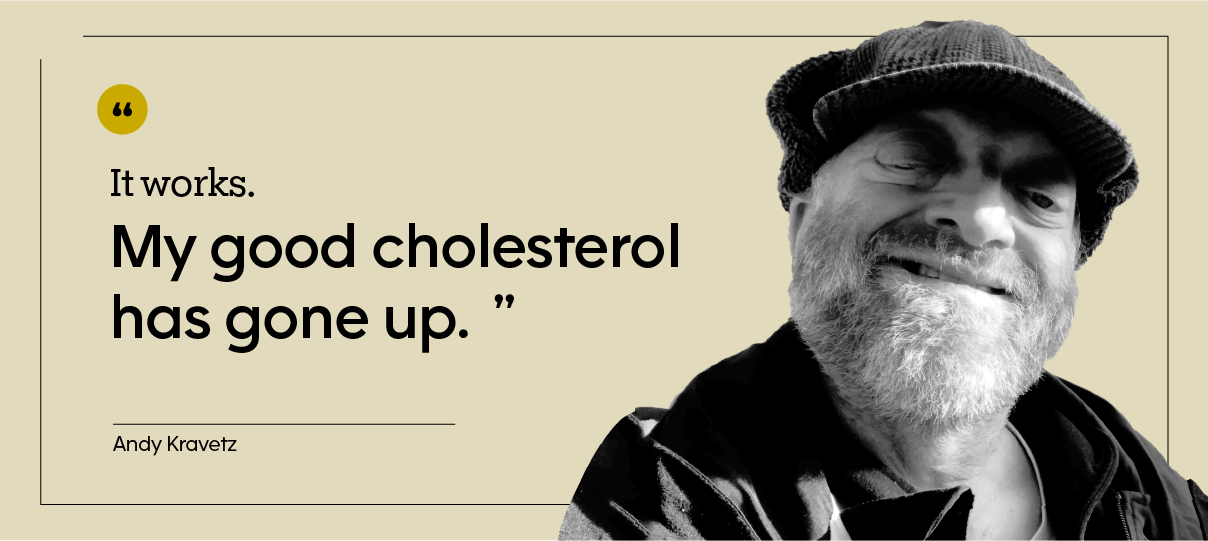 “It works. My good cholesterol has gone up, and they want me to stay on it,” says Andy, who adds that as he’s aged, his total cholesterol has increased to between 160 and 170.