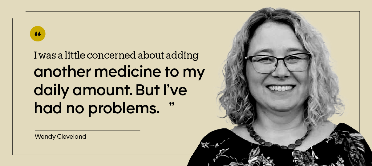 “I didn’t feel anything different,” says Wendy, a 50-year-old therapist in Columbus, Ohio. “Because I also take other medicines, I was a little concerned about adding another medicine to my daily amount. But I’ve had no problems.”