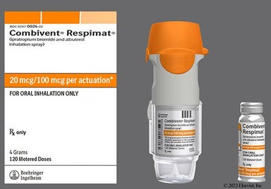 Combivent Respimat is an inhaler that's used to treat chronic obstructive pulmonary disease (COPD) in adults. It's a combination medication that contains two different bronchodilators: ipratropium, a short-acting muscarinic antagonist (SAMA), and albuterol, a short-acting beta agonist (SABA). The medication is inhaled through the mouth 4 times a day, but up to 6 times per day if instructed. Combivent Respimat (ipratropium / albuterol) isn't a rescue inhaler; it's used regularly rather than as needed for sudden breathing problems. Side effects aren't common but can include upper respiratory tract infections and cough.