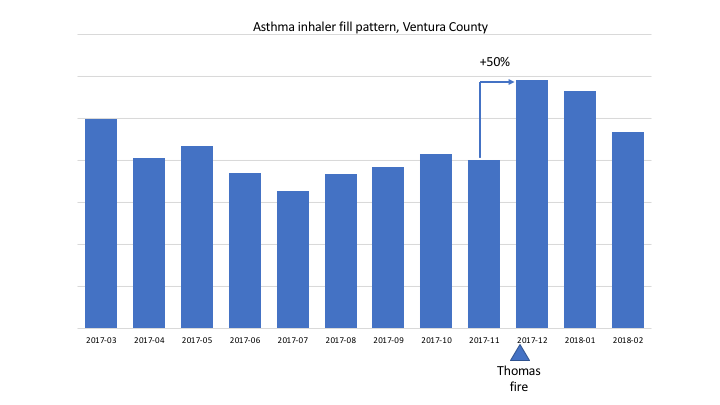 Similarly to what happened in the Bay area in October, there was a sharp increase of asthma inhaler fills during the month of the fire in Ventura county. This increase extended into January after the fire had been mostly contained, suggesting that people may have refilled prescriptions sooner than they would normally because of increased use during the worst of the fire.