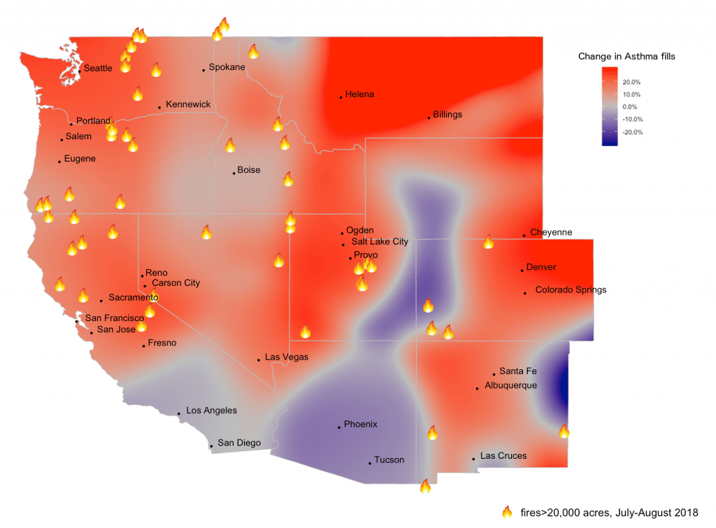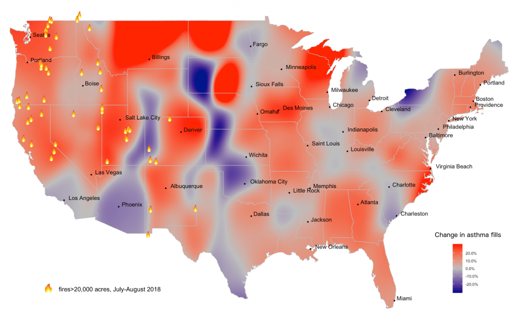 This analysis is based on a large sample of data from pharmacies and insurers, and compared the number of fills of asthma medications from July to August 2018 to the average of fills from 2015, 2016 and 2017 during the same time period. These three years constitute the “normal” pattern for asthma medication prescriptions. The data measures prescription fills for 26 asthma medications, including Qvar, Accuneb, Airduo, Advair, and Dulera. Fires shown in the map have devastated at least 20,000 acres in the United States and British Columbia.