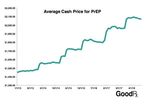 While it works well, Truvada is expensive. According to a representative sample of US prescription fills, prices for Truvada have increased by 45% since 2013, with cash prices now above $2,000 for a month’s supply. What’s more, prices for Truvada have increased by nearly 10% at the beginning of the past four years. Should this trend continue, the monthly cash price for Truvada could cross $2,200 in 2019.