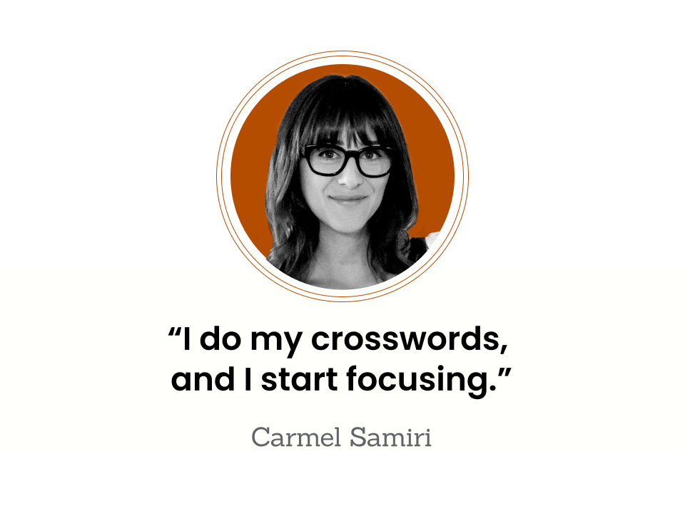 Carmel, who’s 34, says she has made her bedtime routine something she looks forward to, a reward for everything accomplished during the day. For her, that reward is doing crossword puzzles.