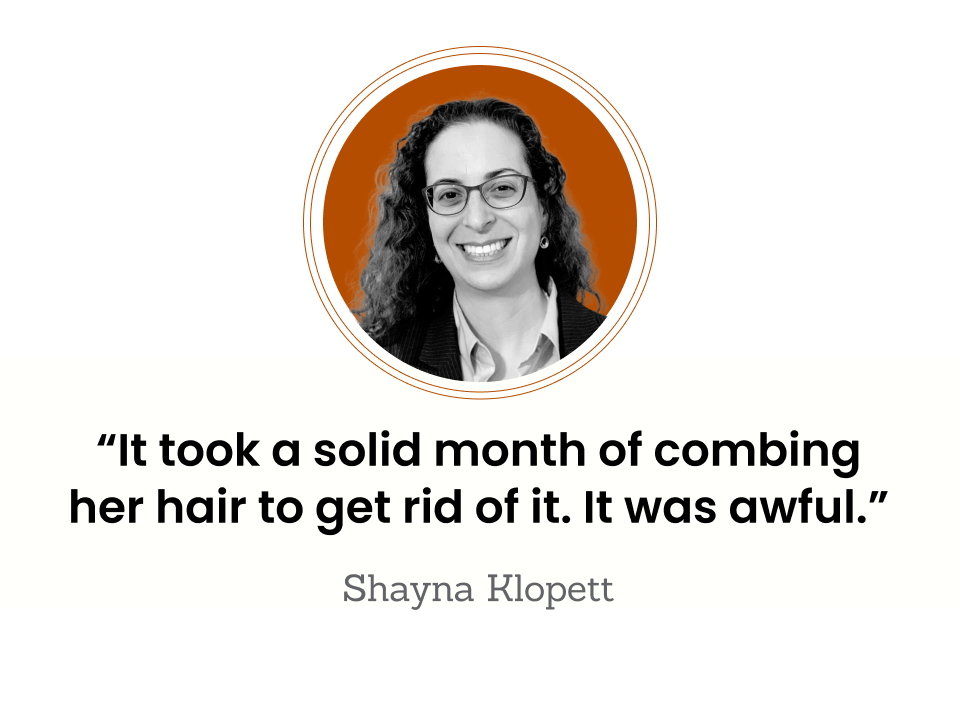 Previously, on a trip to Israel, the whole family had gotten lice. When Shayna’s daughter picked them up again at summer camp, Shayna felt the stigma in America was far worse. In Israel, the family “went to the pharmacy and there was a floor-to-ceiling rack of different medications,” Shayna reports. “In the United States, there was like one bottle.”