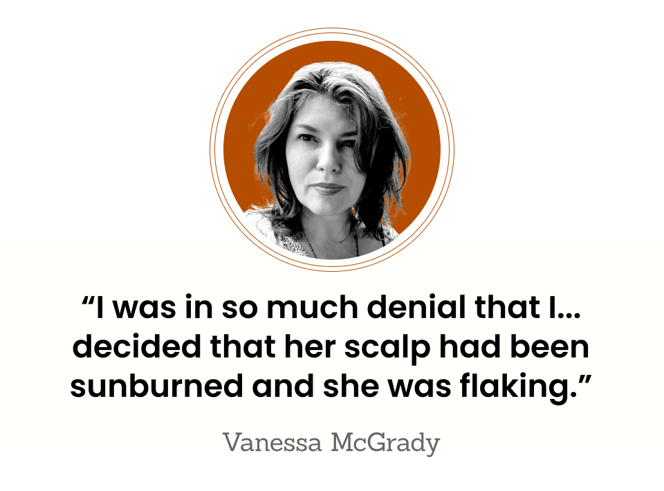 “Her best friend had lice a few weeks prior, but I thought that was way in the past,” Vanessa says. “In fact, I was in so much denial that I looked at the white nits and decided that her scalp had been sunburned and she was flaking.”