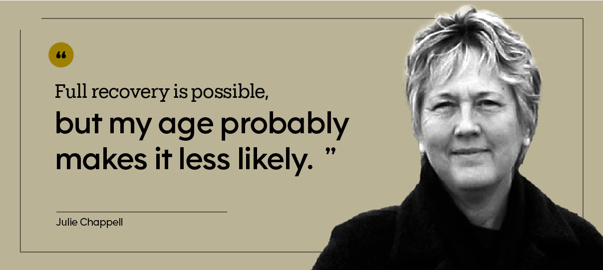 “Full recovery is possible,” she says, “but my age probably makes it less likely.”