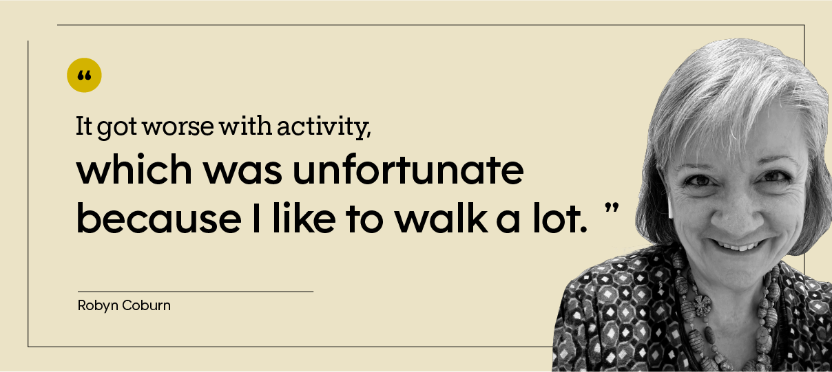 “It got worse with activity, which was unfortunate because I like to walk a lot,” Robyn says. “I used to walk in my neighborhood every morning. That was my exercise, but my feet got more and more sore.”