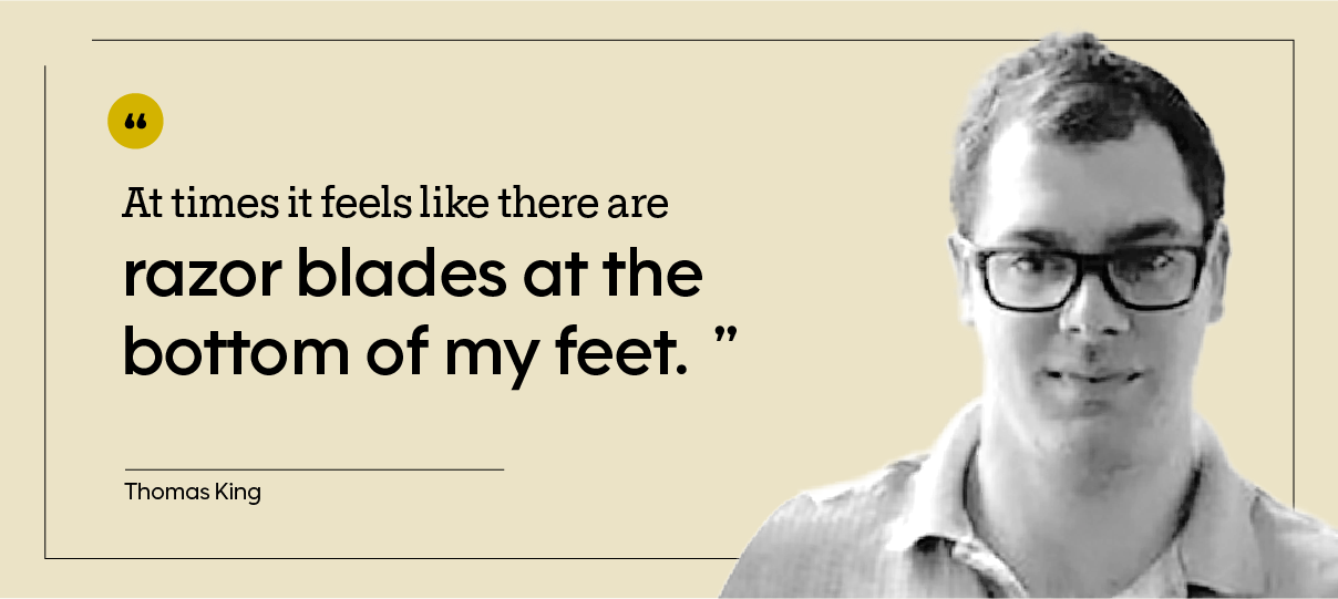 Surgery to release the band on his left foot helped, but “was not the miracle I thought it would be,” he says. Thomas finds some relief wearing Oofos, molded shoes that are said to provide stability while absorbing impact. And he’s gotten an accommodation at work: He can now sit while on the job.
