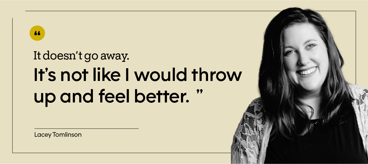 Lacey describes the experience like a hangover — “that unsettled feeling in your stomach” — that never ends. “It includes actually vomiting, but also a lot of dry heaving,” she says.