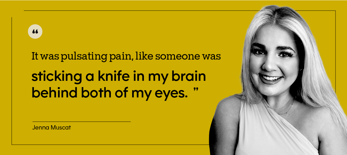 “I can’t put into words the pain, but it’s more pain than I had ever experienced in my life,” Jenna says. “It was pulsating pain, like someone was sticking a knife in my brain behind both of my eyes.”