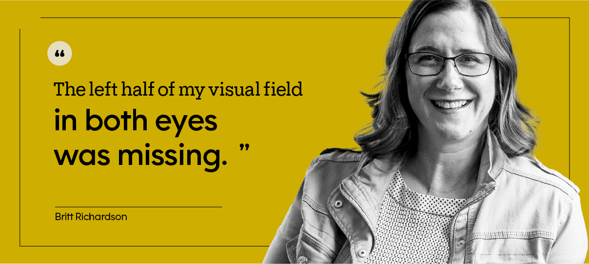 “I wasn’t having any pain,” Britt says, but “the left half of my visual field in both eyes was missing.”