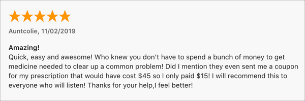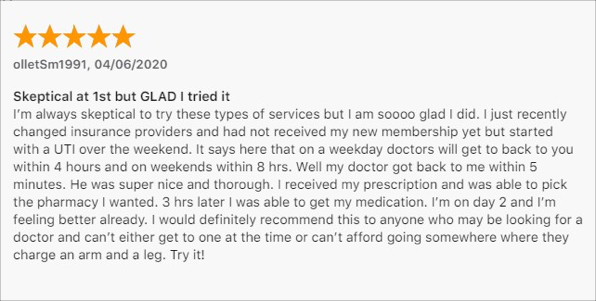 At GoodRx Care, we see a lot of people who are using telemedicine for the first time. And naturally, some people have some skepticism about getting their medical treatment online. Because the telemedicine experience can sometimes feel very different from an in-person visit, some of our patients find it hard to believe at first that they can get the same quality of care. We’re proud to say that we have over 5,000 reviews on the Apple App Store with an average 5-star rating, and our customers report quick, thorough, high-quality experiences.