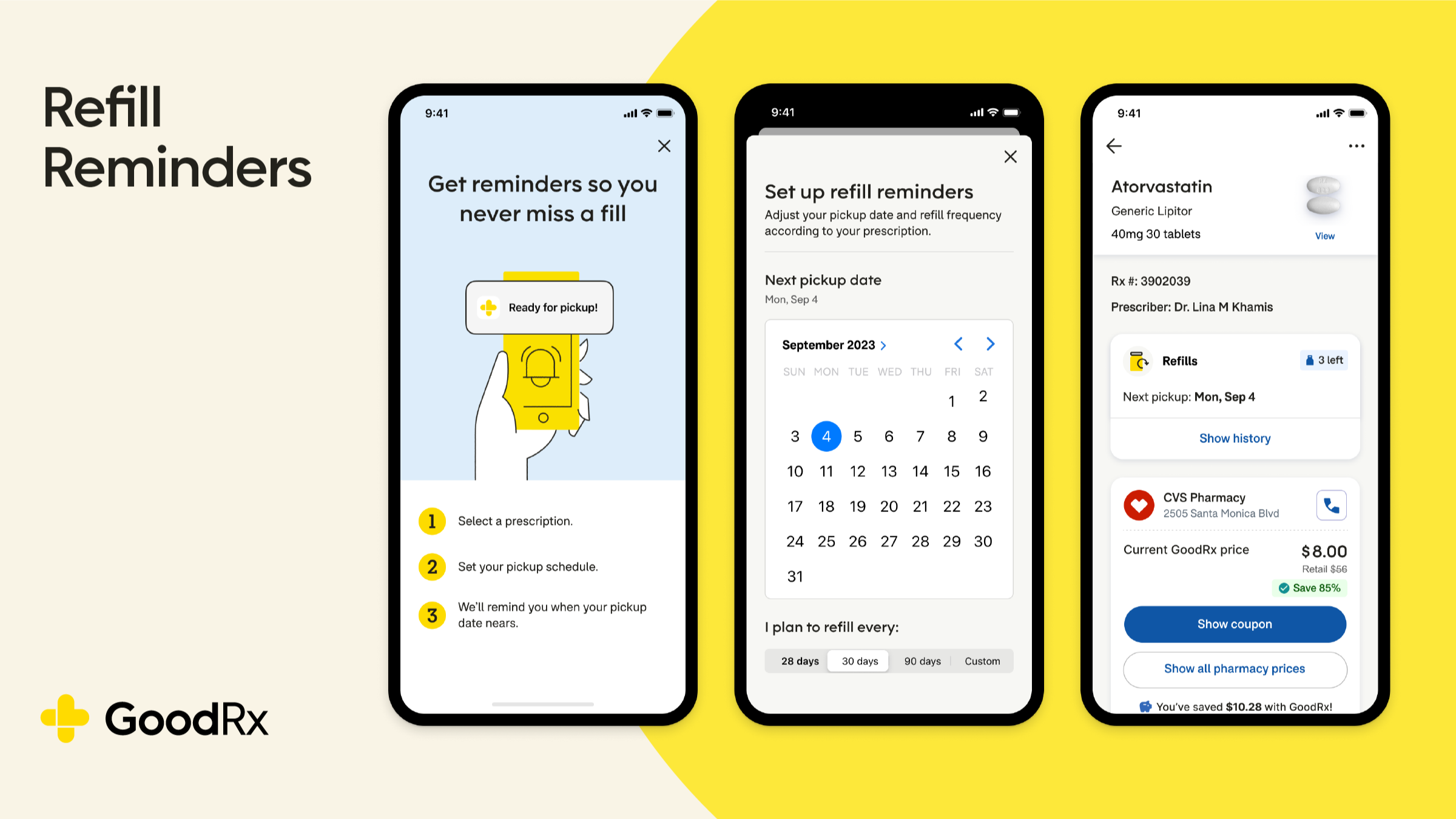 Medicine Cabinet is user-friendly and easy to set up. All you need to do is download the GoodRx app, available now on iOS and coming soon to Android. GoodRx prescriptions are automatically added to your Medicine Cabinet when you’re logged in, and any additional prescriptions are easy to add. You can set up daily reminders, get refill reminders, find your best pharmacy, and start racking up GoodRx Rewards points.