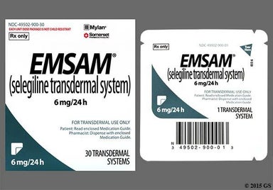 Emsam, the brand name for selegiline patch, is used to treat depression in adults. It belongs to a group of medications called monoamine oxidase inhibitors (MAOIs) that work by raising certain chemicals in the brain to help improve mood. You apply the patch to your skin once a day, and it comes in three different dosages. Common side effects of this antidepressant include application site reactions, trouble sleeping, and headaches.