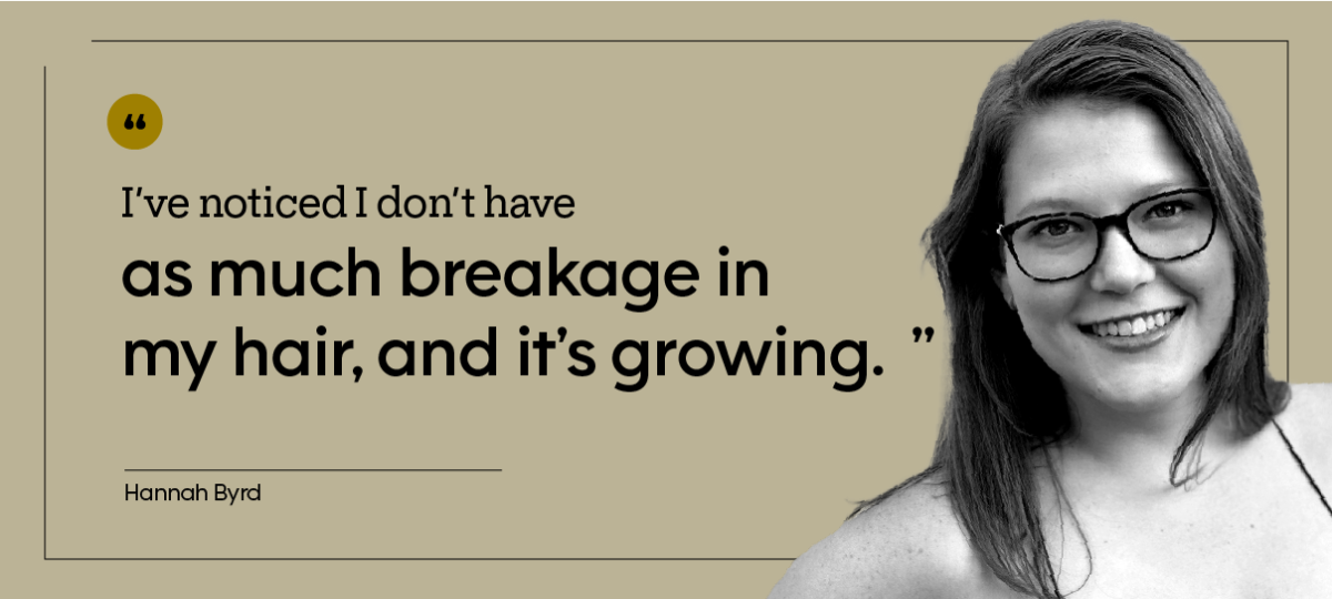 “I’ve noticed I don’t have as much breakage in my hair, and it’s growing. For someone who used to go a year or more between haircuts because her hair didn’t grow enough to warrant it, it’s a Christmas miracle,” Hannah says. “The skin on my face does seem to be getting better. And I feel like some of the old acne scarring is starting to go away. However, that could be the retinol I use at night.”