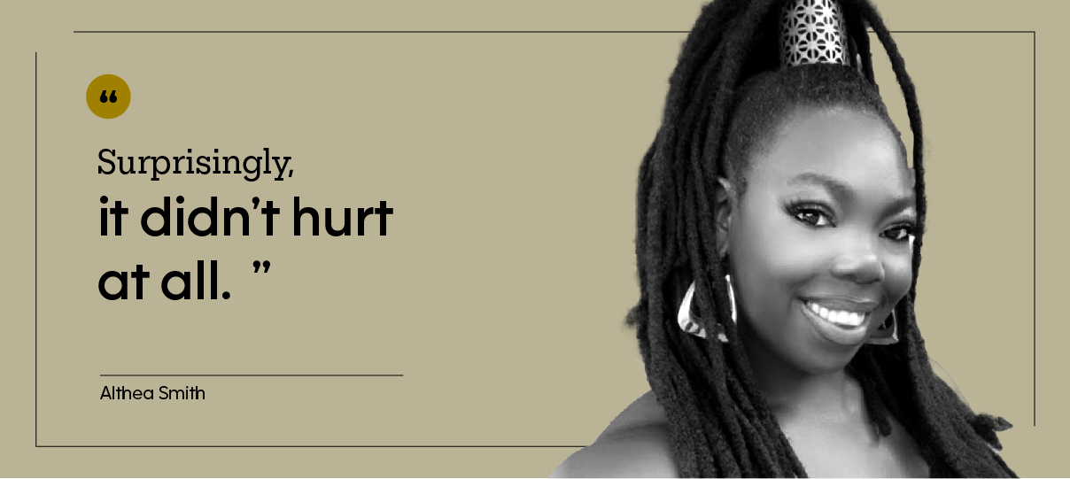 “I thought getting a tattoo was going to have me in excruciating pain. Surprisingly, it didn’t hurt at all. In fact, I really enjoyed the sensation. It felt kind of soothing, in a way,” Althea says. “Weird, right?”