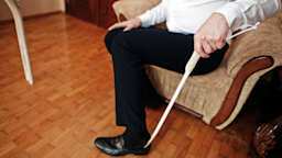A hip kit — which includes items like a grabber/reacher, shoehorn, long-handled sponge, dressing stick, sock aid, and elastic shoe laces — that costs about $25 to $65