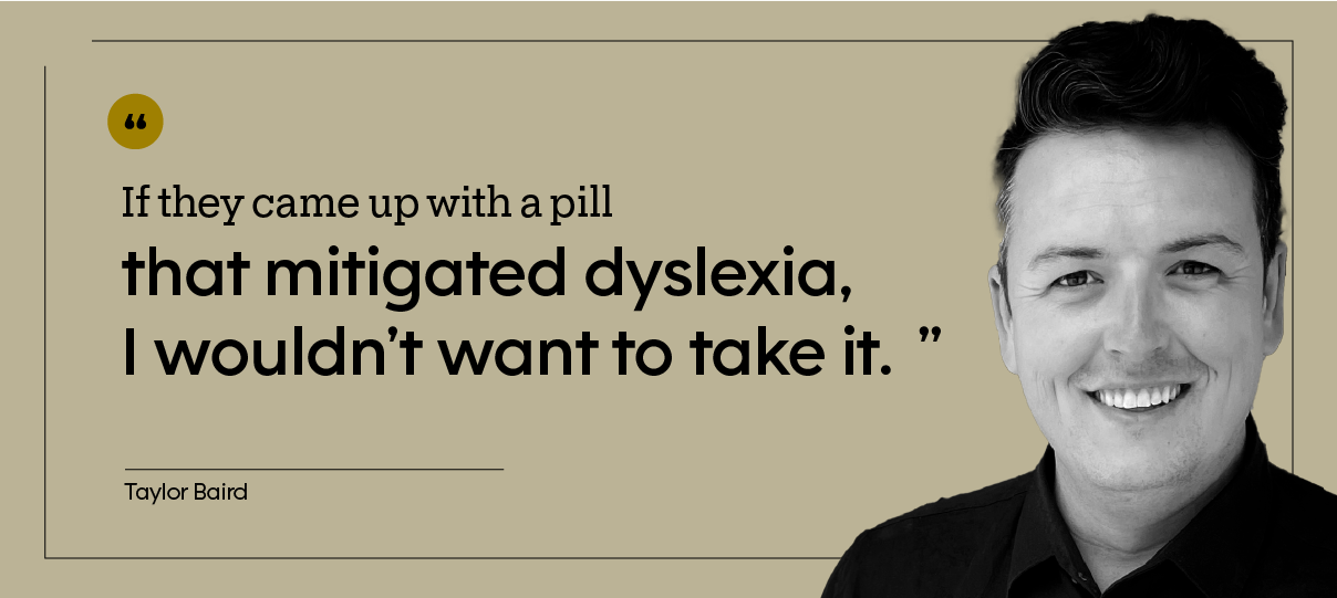 Taylor didn’t go on to get a professional diagnosis. “You can get insurance coverage to get tested officially for dyslexia when you’re a child. But once you’re an adult, it’s not like you’re going to do extra classes to improve reading, so there’s no insurance coverage, and it’s thousands of dollars to get tested,” he explains.