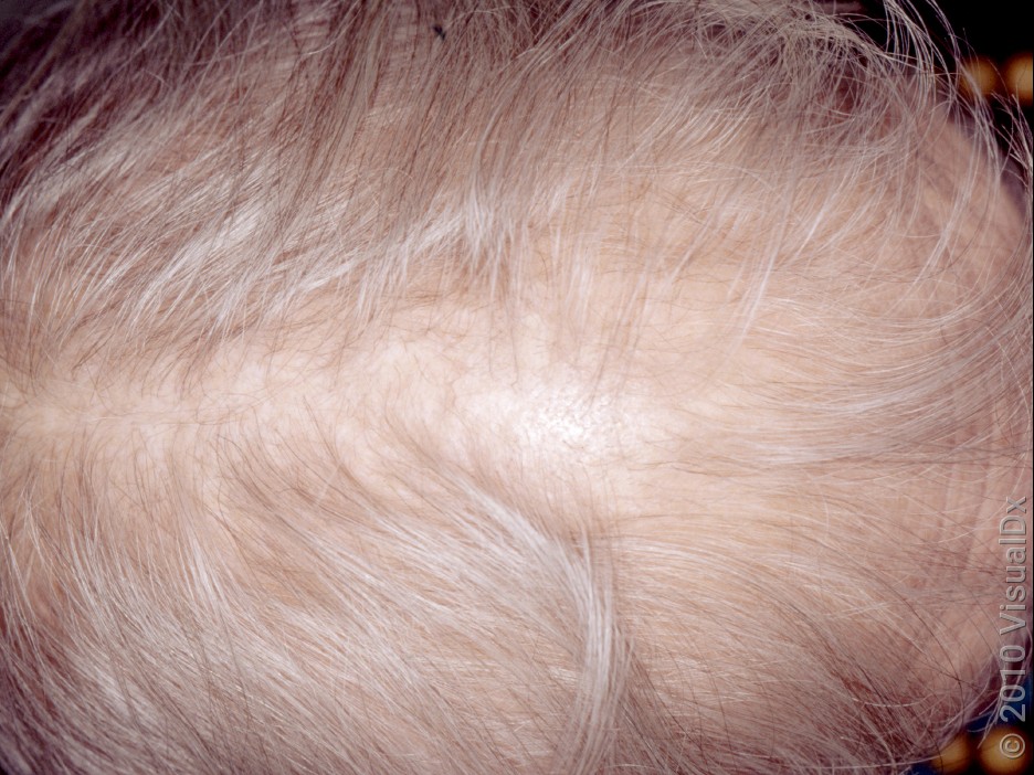 The hair thins at the top of the scalp (the crown) and doesn’t involve the front hairline.