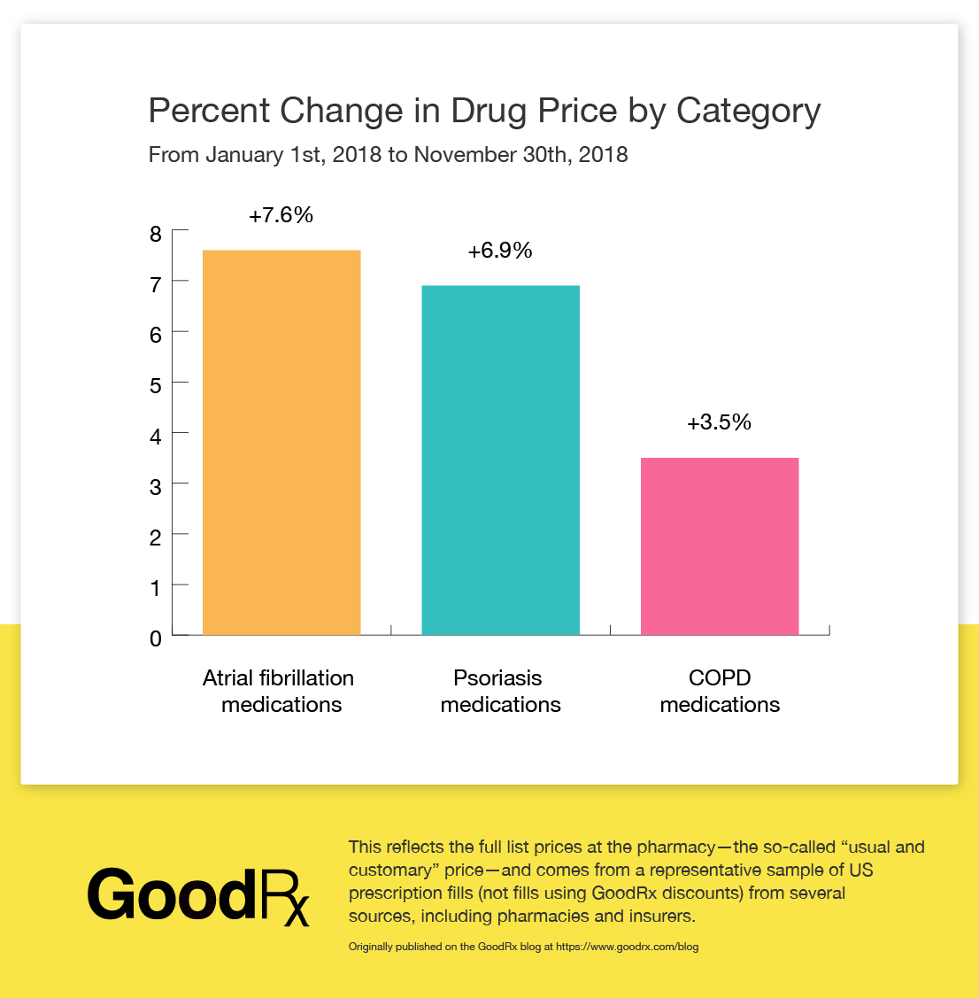 From 2017 to 2018 prices for atrial fibrillation medications increased by 7.6%, prices for psoriasis medications increased by 6.9%, and prices for COPD medications increased by 3.5%.