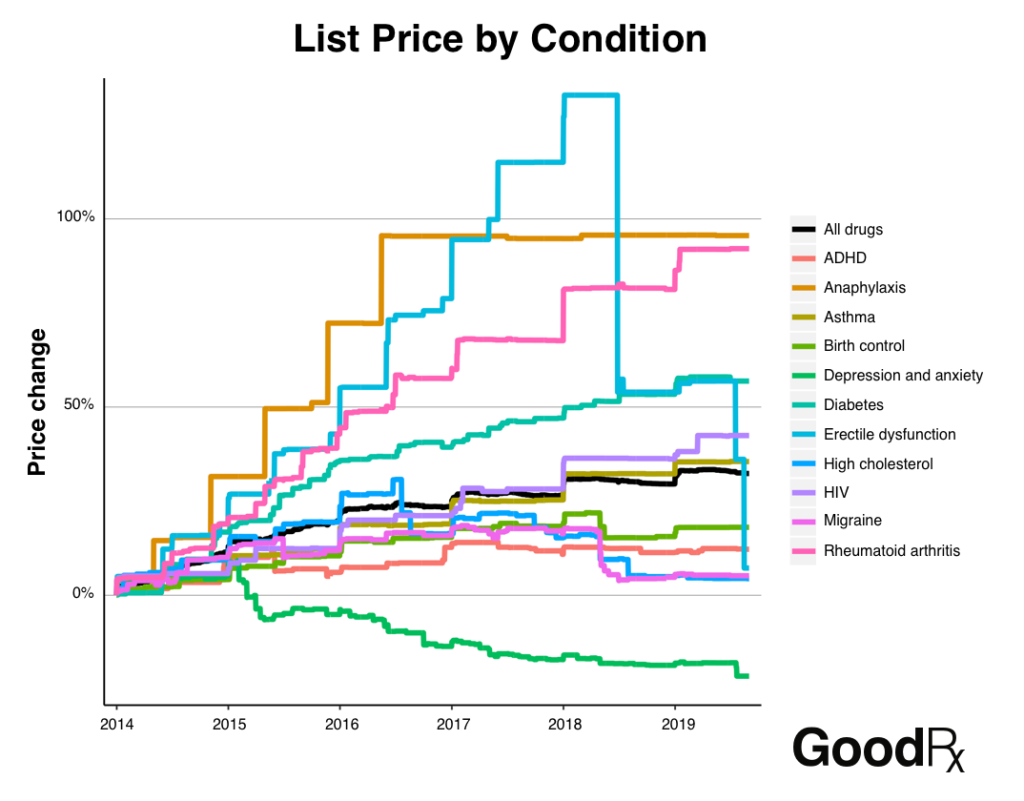 As it turns out, prices for drugs that treat certain conditions are rising faster than others. Specifically, prices for drugs that treat rheumatoid arthritis and anaphylaxis have increased by over 90% since 2014, while prices for depression and anxiety medications have dropped by 18%.