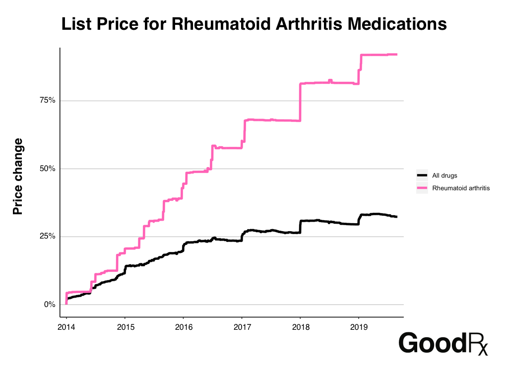 The average list price for rheumatoid arthritis medications has increased by 92% since 2014, and it may continue to climb.