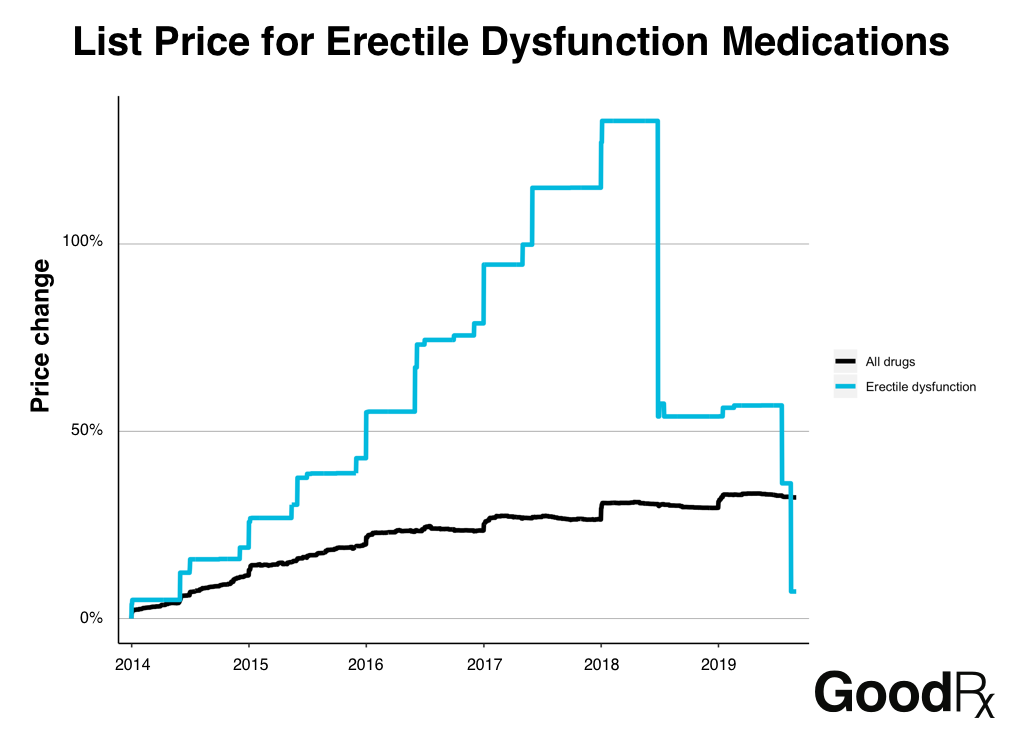 But after rising in lockstep multiple times per year, the average list price for erectile dysfunction medications dropped drastically and is now only 7% more expensive than it was 5 years ago.