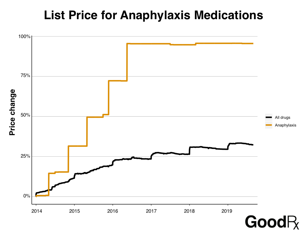 The average list price for anaphylaxis medications, like EpiPen and Adrenaclick, has increased by 96% since 2014, far surpassing the rate of increase in the average list price of all drugs (32%).