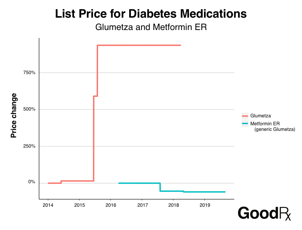 First off, the list price for one drug, Glumetza, has increased by nearly 1,000% since 2014. While this is a large increase, the cheaper, generic version of Glumetza, metformin ER, is more commonly prescribed.