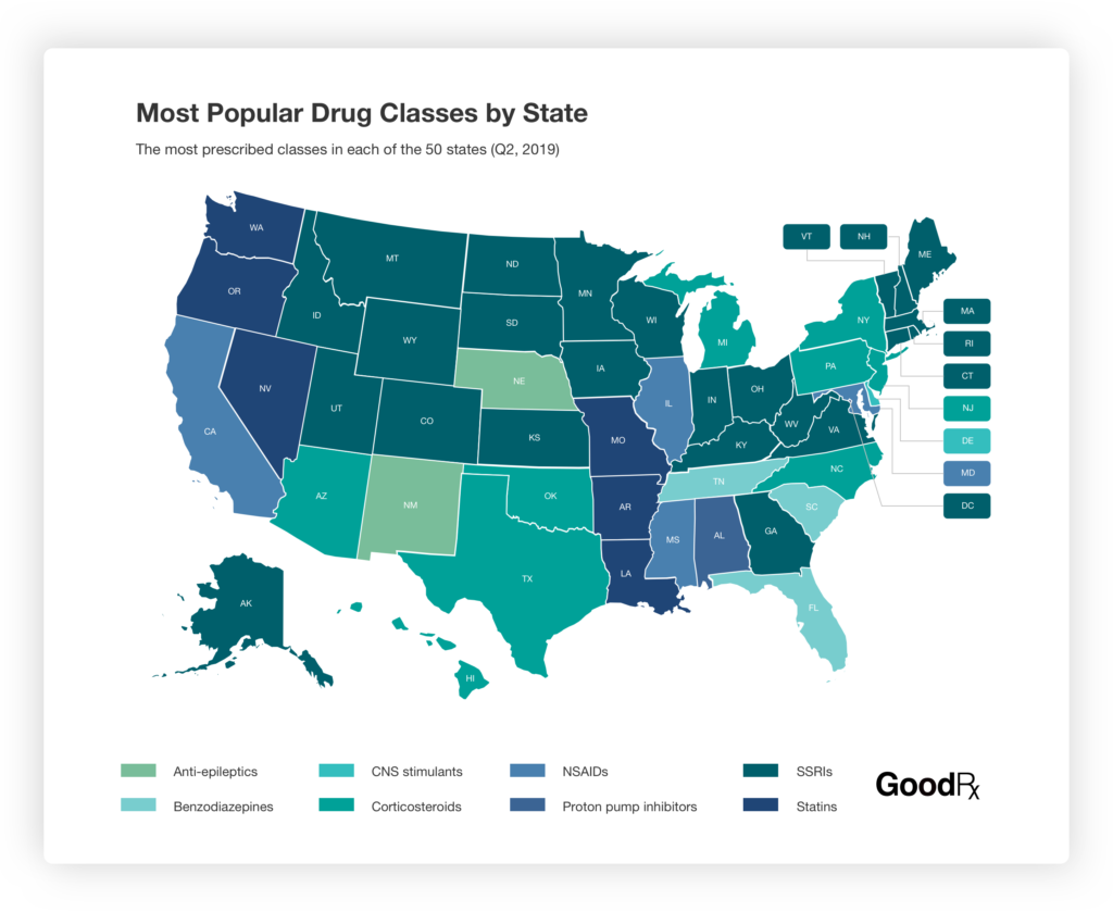 During Q2, the most frequently prescribed class in twenty-five states was SSRIs, followed by corticosteroids (popular in nine states) and statins (popular in six states).