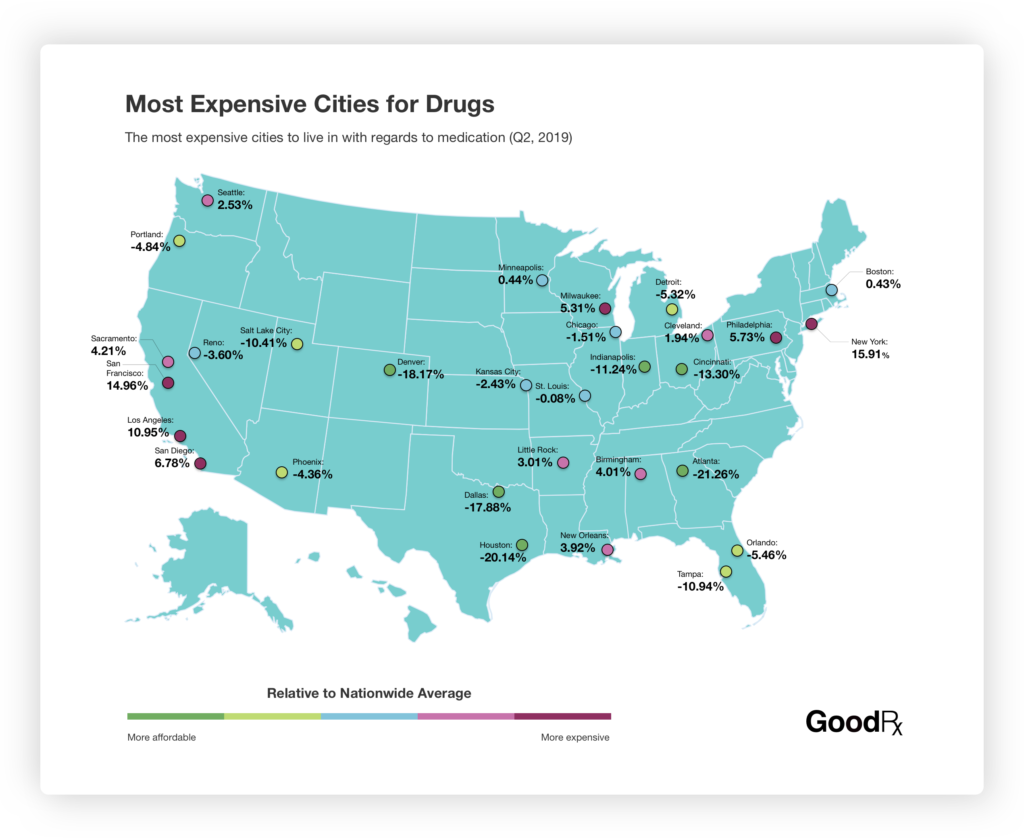 Los Angeles, New York, and San Francisco continue to be the most expensive cities for prescription medications, with prices 10% higher than the national average.