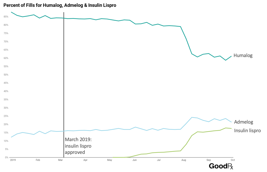 This is a typical fill pattern, and one we have seen for other blockbuster drugs like Viagra. But the same can’t be said for Humalog, a short-acting insulin used to help control blood sugar levels in people with diabetes. Back in March, insulin lispro (the generic counterpart to Humalog) was approved by the FDA, but more than 6 months later the majority of fills are still for the expensive brand drug.