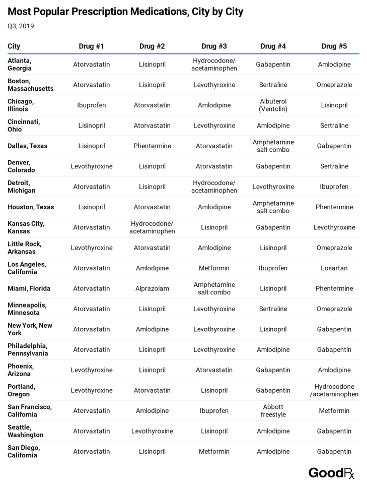 The most popular drugs nationwide provides a snapshot of the conditions that plague the U.S., but what do things look like on a city level? In general, atorvastatin (Lipitor), lisinopril (Zestril, Prinivil), amlodipine (Norvasc), and levothyroxine (Synthroid) are popular in most cities, a trend that is in line with nationwide prescription fills.