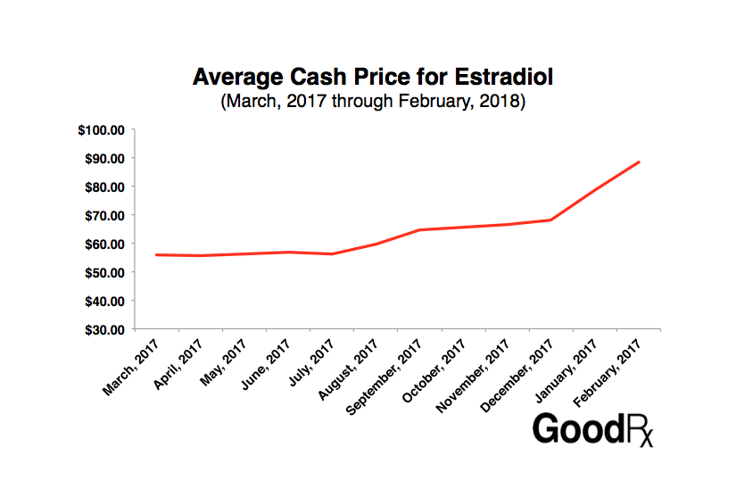 Drug prices constantly fluctuate, changing incrementally month over month. One noteworthy price change in February occurred with Estradiol, a popular generic hormone used to treat menopause symptoms and prevent osteoporosis. Prices climbed by over 11% since January, rising from $78.93 to $88.44. This price increase is nothing new – back in 2013, the average cash price for a 30-day supply of Estradiol was a mere $26.