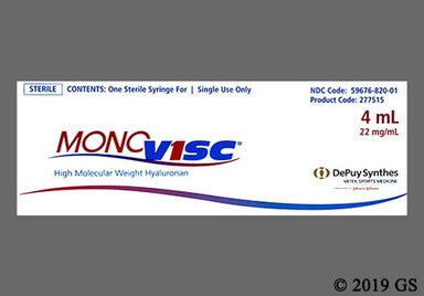 Monovisc (hyaluronic acid) is a viscosupplement that's injected into the knee joint to ease pain from osteoarthritis (OA) in adults. It's usually prescribed for people who continue to have pain despite having tried certain treatments, such as exercises and acetaminophen (Tylenol). Monovisc (hyaluronic acid) given as a single injection by a healthcare professional (HCP). Some potential side effects of this knee injection include joint pain, joint swelling, and injection site pain.