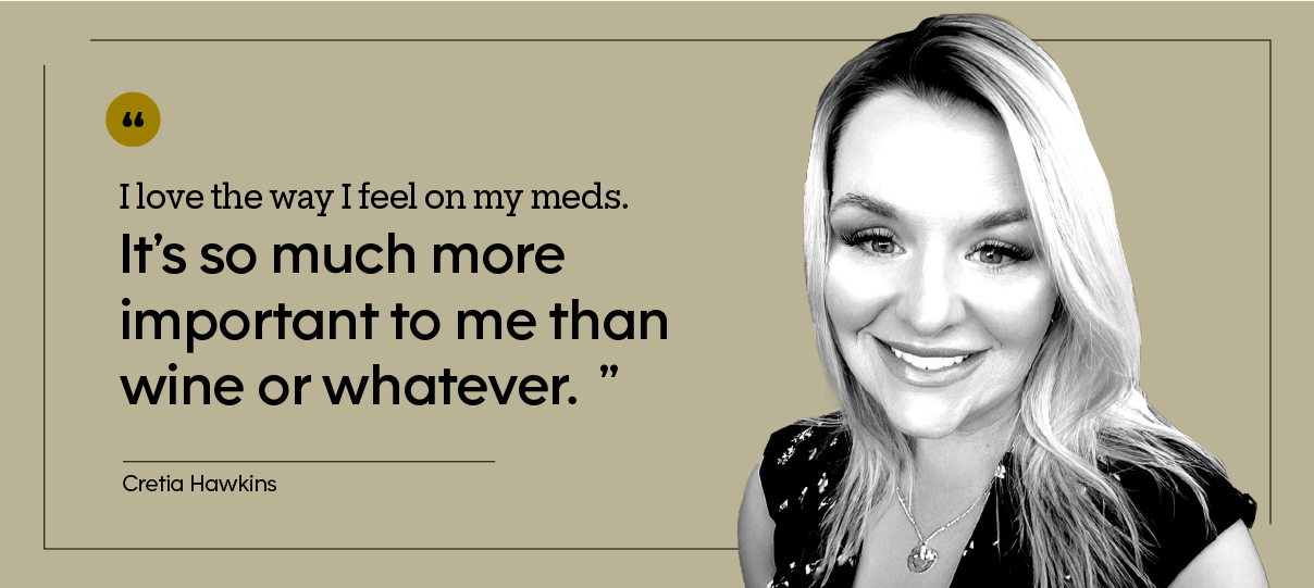 “I love the way I feed on my meds,” Cretia says. “It’s so much more important to me than wine or whatever.”
