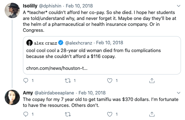 Heather Holland, a second-grade teacher in Fort Worth, Texas, decided not to fill her prescription for Tamiflu when she saw it would be $116. Her husband says they could have afforded the medication, but she refused to pay out of principle. Three days later, she died from flu-related complications.