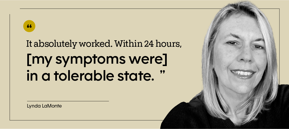 Paxlovid pills are large, and swallowing them with a sore throat was difficult. But Lynda’s throat began to feel better within a few hours of taking the medication. “It absolutely worked; it was effective, she says. “Within 24 hours, [my symptoms were] in a tolerable state.”