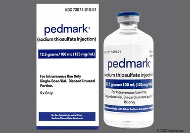 Pedmark (sodium thiosulfate) is the first and currently only FDA-approved therapy used to prevent hearing damage from cisplatin treatments that last 1-6 hours. It's used in children older than 1 month old. Pedmark (sodium thiosulfate) is infused into the veins by a healthcare provider.