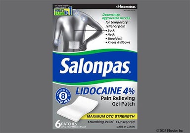 Lidocaine 4% patch (Salonpas) is an over-the-counter (OTC) medication used to relieve minor muscles and joint pain in adults and children 12 years and older. It's often used for temporary relief of backaches, arthritis, strains and sprains, and bruises. The patch is a local anesthetic that numbs the area where it's applied. You place the patch directly on the skin and can use it 3 to 4 times a day, leaving it on for up to 8 hours at a time. Common side effects include mild skin irritation or redness where the patch is applied.