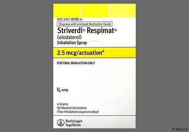 Striverdi Respimat (olodaterol) is a type of bronchodilator called long-acting beta agonist (LABA). It's used to treat chronic obstructive pulmonary disease (COPD) in adults. The typical dose is 2 inhalations once daily at the same time each day. Side effects aren't common but can include the common cold and upper respiratory tract infections.