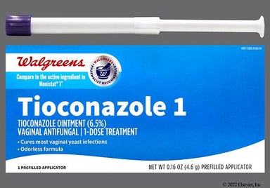 Tioconazole is an over-the-counter (OTC) antifungal ointment that's used to treat vaginal yeast infection. To apply, you insert the pre-filled applicator inside the vagina and push the plunger to dispense the medication. You only need a single dose for the full treatment. Most people start to experience some symptom relief within one day. Common side effects of tioconazole include temporarily vaginal burning and itching.