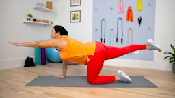 Extend your right arm and left leg simultaneously and keep your balance steady. Your arm should be straight forward and your leg should be straight back. Both should be parallel to the floor.