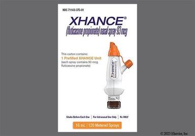 Xhance (fluticasone) is a corticosteroid nasal spray. It treats chronic rhinosinusitis in adults with and without nasal polyps. Unlike most other nasal sprays, Xhance (fluticasone) has a mouthpiece for your mouth and a nosepiece that you insert into your nostrils. In order to use Xhance (fluticasone), you blow into the mouthpiece and press down on the bottle to deliver the sprays into your nostrils. The typical dose is 1 or 2 sprays per nostril twice a day. The special delivery system gets medication high in your nose where polyps are, but can sometimes cause nosebleeds and irritation as side effects.