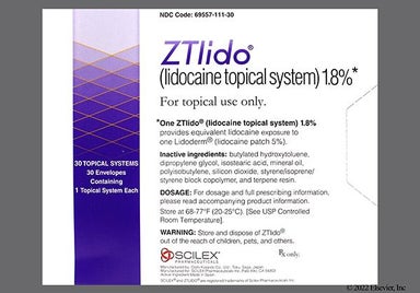 Ztlido (lidocaine 1.8%) is a prescription patch used to relieve nerve pain caused by a shingles infection, also known as postherpetic neuralgia (PHN). It's a local anesthetic so it works by numbing the nerves in the area where it's applied. Ztlido (lidocaine 1.8%) is similar to Lidoderm (lidocaine 5%), but uses a newer patch design that delivers the same full dose of medication with less lidocaine. You apply the patch to your skin once a day for up to 12 hours in a 24-hour period. Common side effects include redness, itching, and mild skin irritation where the patch is placed.